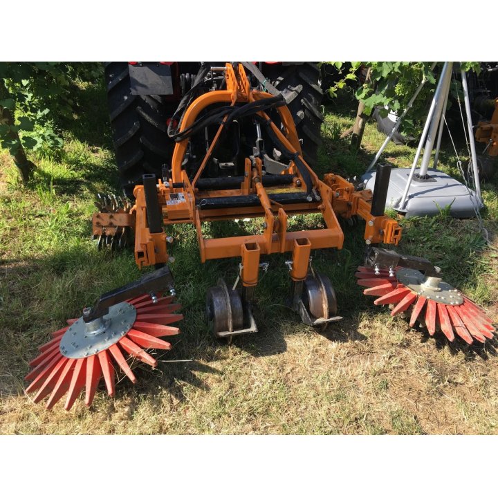 A bemutató gép 190-300 cm között állítható munkaszélességű és az átszerelhető váznak köszönhetően előre függesztve is dolgozhatunk vele. Elöl 4 csillagkerékkel szerelve, mintegy 38 cm a tövek alatti közvetlen munkaszélesség. Hátul a nagy keménységű gumiujjas forgókerék 70 cm átmérőjű.