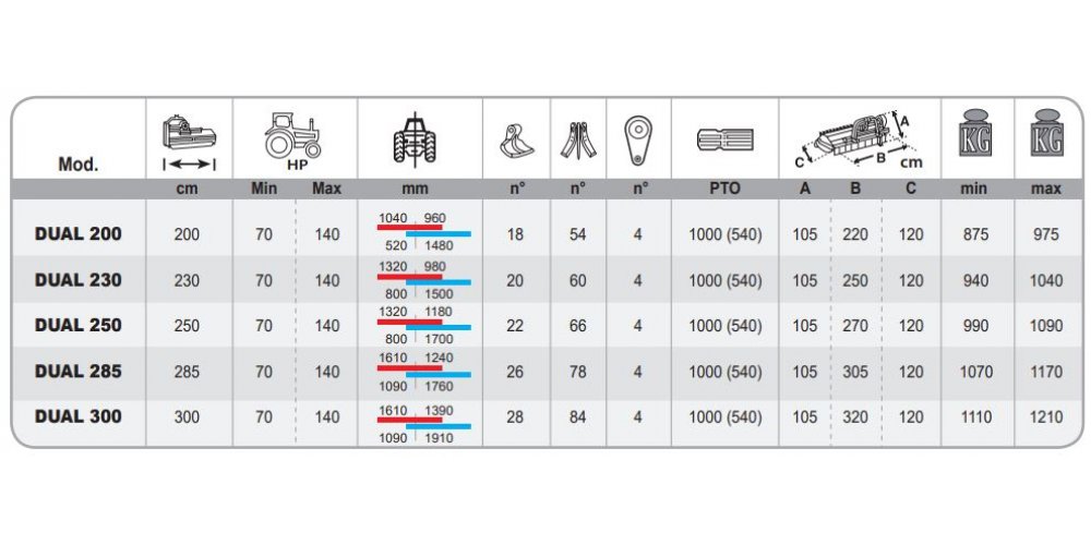 | Mod. | Munkaszélesség | HP min. | HP max. |