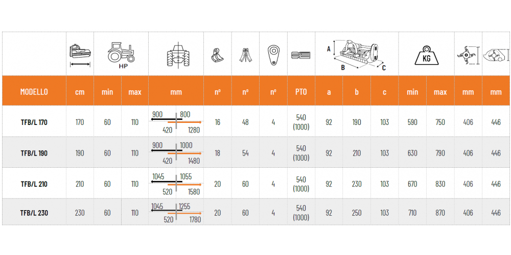 A mulcsozó szőlőültetvényekhez és gyümölcsösökhöz készült, alkalmas fű, bokrok, metszési hulladék és akár 7 cm átmérőjű ágak aprítására. 60 és 110 lóerő közötti traktorokkal működtethető. A gép többféle sorközművelő eszközzel is felszerelhető.